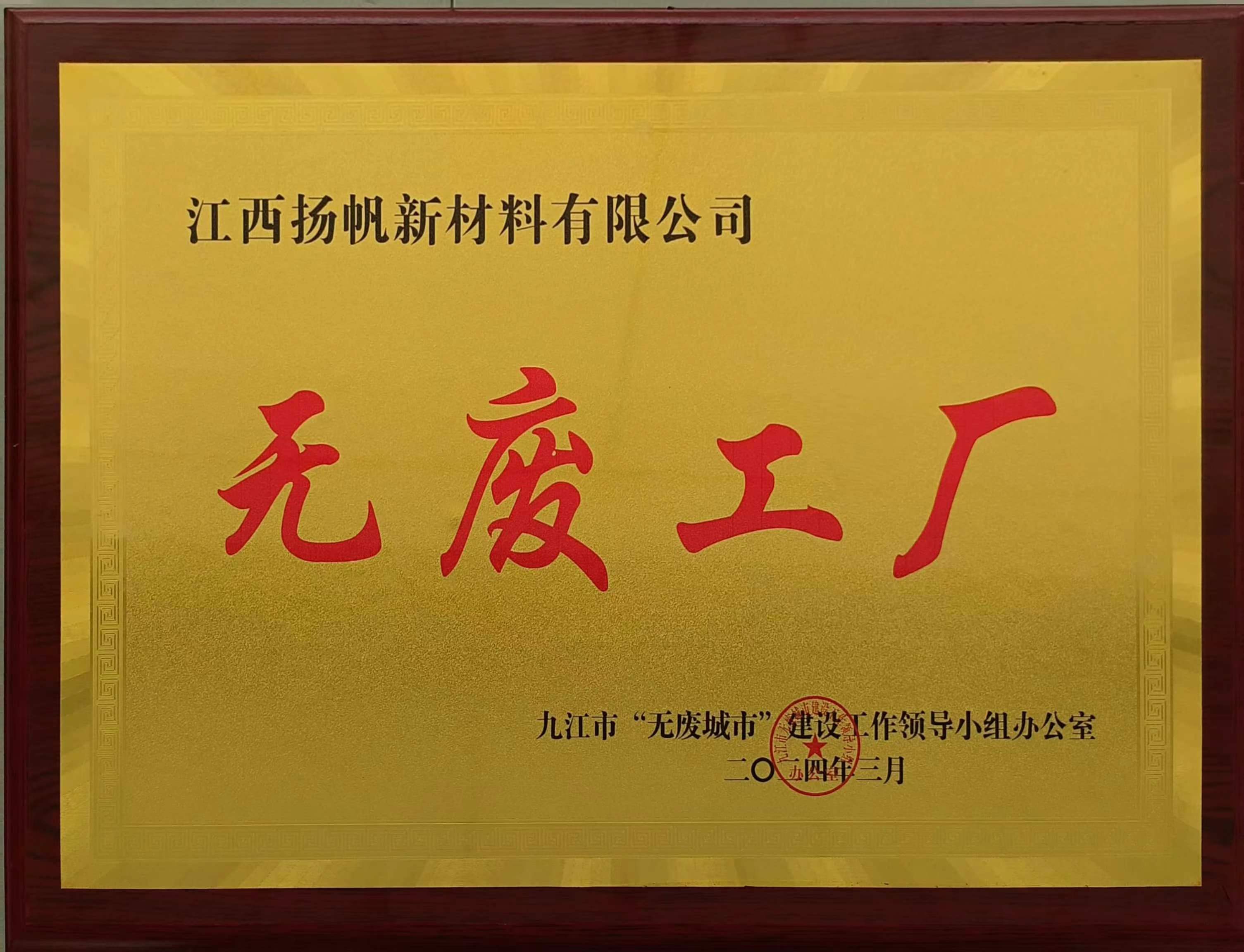 4月26日,九江市“無廢城市”建設工作領導小組辦公室授予江西揚帆新材料有限公司 “無廢工廠”稱號,標志著公司在廢物減排方面取得了顯著成果,并得到上級部門的認可和肯定。