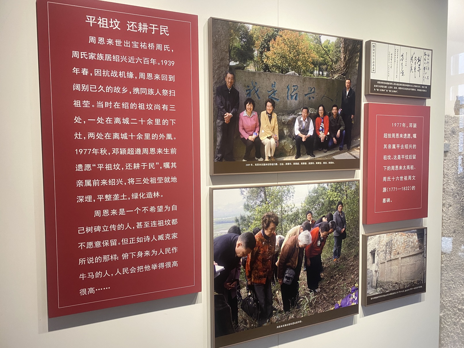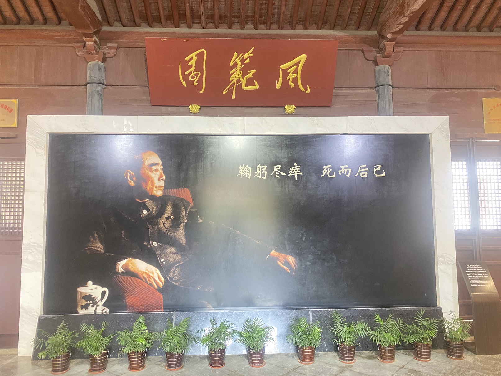 風(fēng)范園(紀(jì)念館)展廳展示了163幅珍貴史料照片、30余件實(shí)物和20部歷史資料片,集中展現(xiàn)了周恩來(lái)“為國(guó)為民孺子牛,任勞任怨絕代尹”的偉大一生,體現(xiàn)了周恩來(lái)勤政廉政的高尚品德。