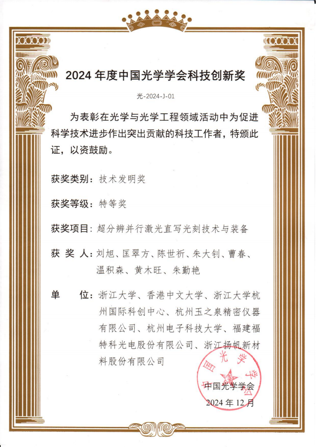 近日,中國光學學會公布了“2024年度中國光學學會科技創新獎評選結果”,我司作為參與單位,參與“超分辨并行激光直寫光刻技術與裝備”項目研發,并榮獲科技創新獎特等獎。